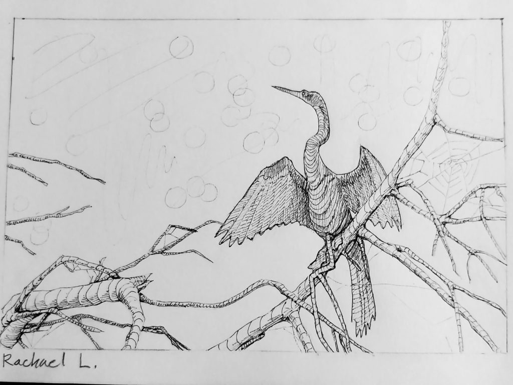 For this second drawing, I focused more on the shadows. I tried cross hatching on the darker and lower parts of the bird and tree branches. I also did not add very much detail to the background, because I thought it would distract from the foreground.
