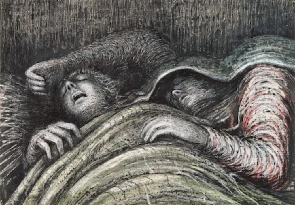 The shape of the people and the blankets look similar to rolling hills. That is because the lines are curved and wavy, somewhat expressing the peacefulness of the sleepers. The woman’s sleeve has a tinge of colour, probably because it adds some warmth and contrast to the overall drawing. At first, the drawing seemed unsettling because I have not seen anything like it. However, as I looked closer, I felt at peace – almost relating to the sleeping people. In conclusion, Moore used many elements of art, such as form, space, and rhythm, which can be seen in the lines.