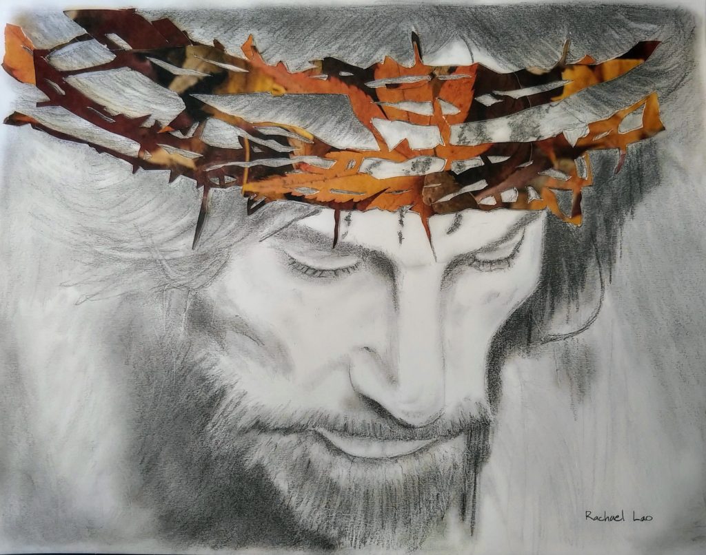 This is a drawing of Jesus Christ wearing a crown of thorns. I used graphite pencils (2B, 4B, and 6B) for the portrait. Then, I taped on a cutout of the crown using scrapbook paper with an autumn-leaves design.