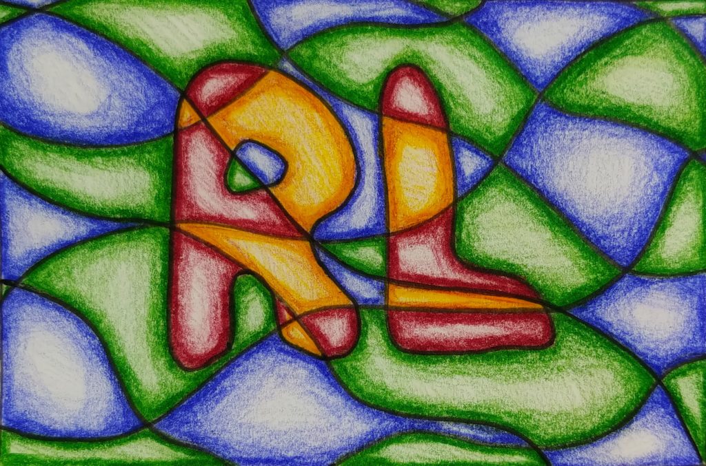I drew the lines with a #2 pencil first, and then I darkened them with a hard-tip brush pen. For the colours, I used wax-based coloured pencils. My initials were warm coloured (red and orange), while the background was cool coloured (green and blue).