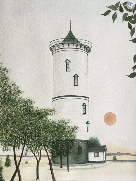 One of Geo Hill’s watercolor paintings shows a tower standing in a field with the sun close to the horizon. The fine brushstrokes and complimentary colors create a sense of balance and unity throughout the piece. Hill’s ability to capture landscapes and landmarks through watercolour impresses me, and I find his work both inspiring and beautiful.