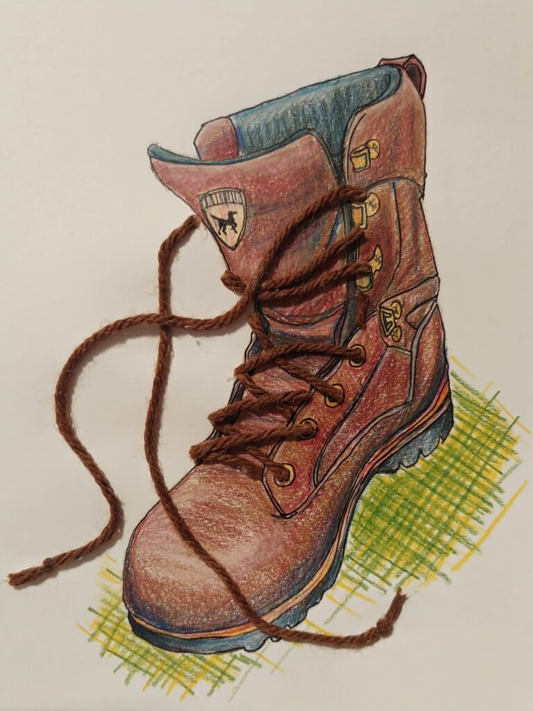 This is a drawing of my brother’s boot. I first drew a pencil sketch and inked it with a fine, black pen. Then, I coloured the boot using coloured pencils. The same was used for the floor / background. I used brown, acrylic yarn as the shoelace and coated it in Elmer’s glue before attaching it to the drawing.