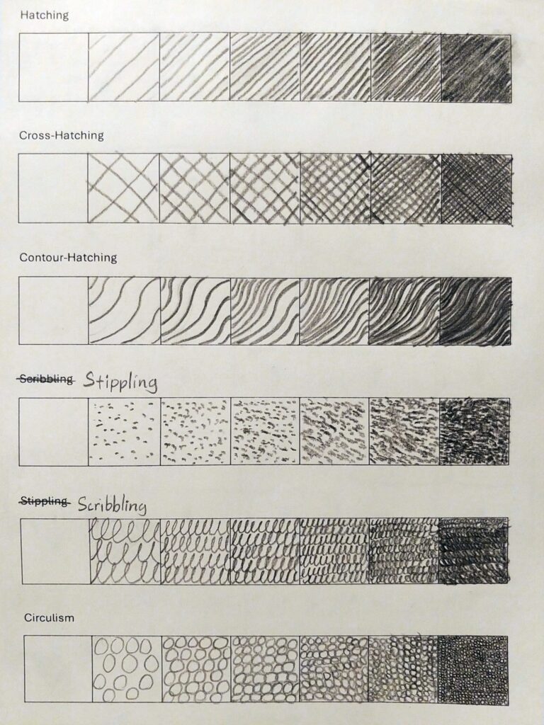 For each technique, the pressure applied to the pencil and the amount of marks made in an area will affect the value. Create a value scale of seven different shades for each of the shading methods in the lesson. You can choose to do this after each section or all at the end. Feel free to use the attached template or create you own.