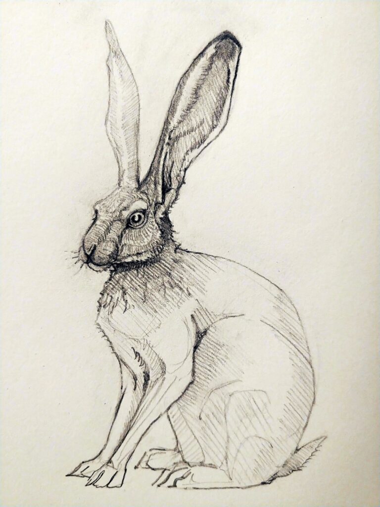 My jackrabbit sketch is inspired by Leonardo da Vinci’s detailed and lifelike drawings. I chose to emphasize one of the jackrabbit’s ears, which is closest to the viewer, by adding the most detail to that part, as well as its head. I used fine lines and some shading for the rest of its body. Then, I exaggerated certain parts of the jackrabbit that capture the most of its vigilant nature by using sharp lines and dark values.