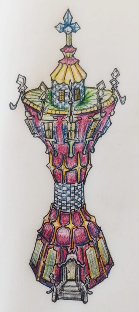 This drawing was inspired by Antoni Gaudí’s El Capricho de Gaudí. Inspiration was also taken from a pepper grinder and fly agaric mushroom. A light pencil sketch was drawn first, then it was inked with a black pen. The colours were added using wax-based coloured pencils.