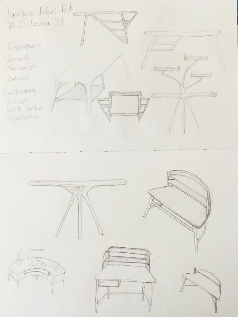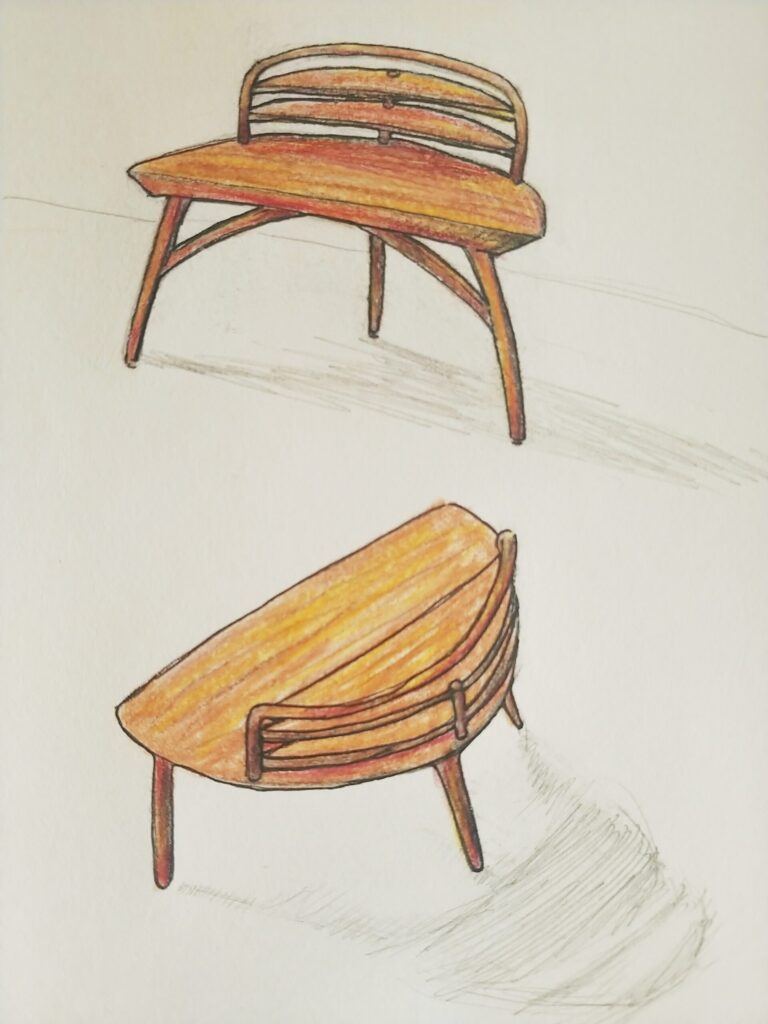 The main inspiration for this drawing is Japandi furniture, which is a combination of Japanese and Scandinavian aesthetics. The desk is simple but also functional with a work surface and shelves. It is made from natural wood and has a curved design to create a sense of flow, making it aesthetically pleasing. Its shelves can be used for displaying stationery items or small houseplants.