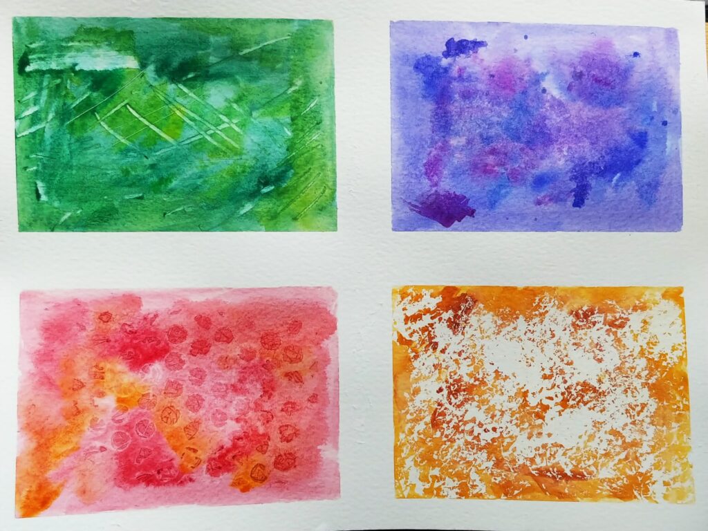 Research different watercolour techniques online and find at least one that interests you. It might be using a different tool or creating a new texture. Take one sheet of watercolour paper and divide it into four. Try three of the techniques from this lesson, as well as the one you researched, in the four quadrants of the page.